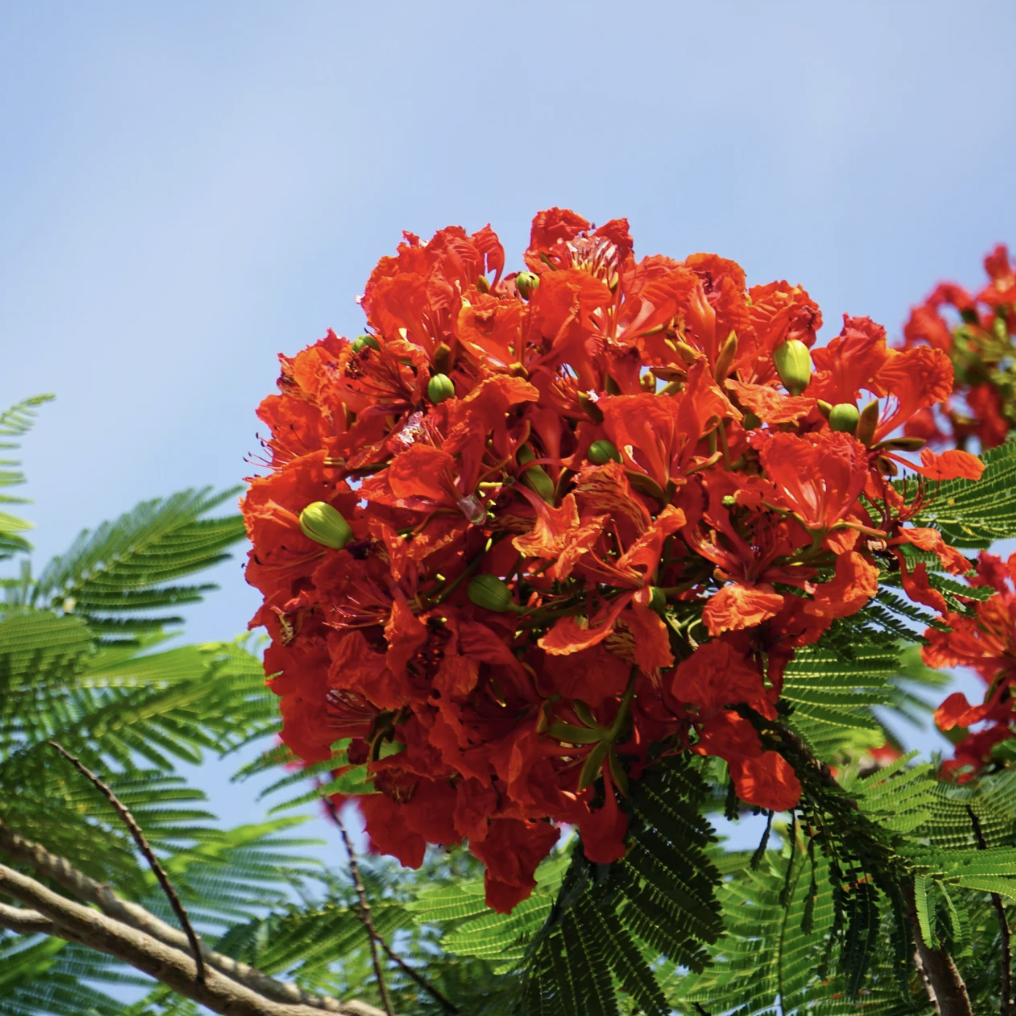 The Royal Poinciana is truly a magnificent tree, gracing the summer landscape with its vibrant orange-red blossoms atop an umbrella-shaped canopy of delicate leaves.
