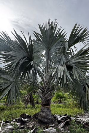 Originating from Madagascar, this majestic palm reaches heights of 30 to 60 feet with a spread of 12 to 16 feet. Its massive costapalmate leaves are typically silver-green but also come in a light olive-green variety. The split leaf bases create an eye-catching pattern on trunks measuring 15–18 inches in diameter. Separate male and female trees produce dark brown inflorescences, with females yielding olive-brown fruit about 1.5 inches across. The bold texture, unique color palette, and impressive stature of this species make it stand out dramatically—though it may overpower smaller residential landscapes.