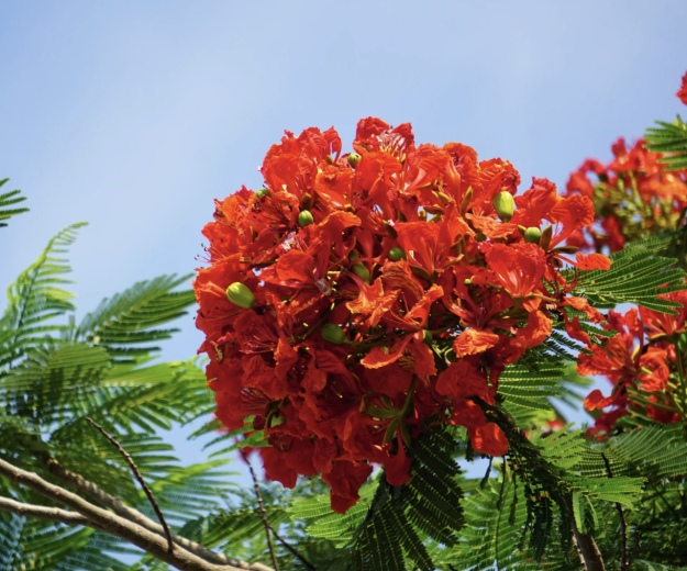 The Royal Poinciana is truly a magnificent tree, gracing the summer landscape with its vibrant orange-red blossoms atop an umbrella-shaped canopy of delicate leaves.