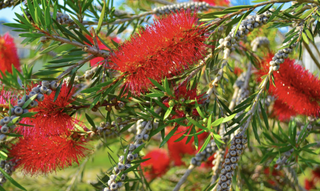 The Bottlebrush is a red-flowering shrub highly recommended as a hedge option for South Florida due to its rapid growth and dense foliage that remains lush from top to bottom.