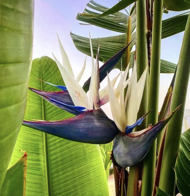 The White Bird of Paradise features striking white flowers with a distinctive dark blue tongue, making it an excellent choice for creating a dramatic effect at entranceways or poolside areas.