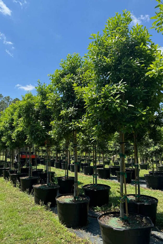 This remarkable evergreen tree, standing 25 to 30 feet tall with a wide-spreading, densely-foliated canopy, commands admiration with its short trunk and broad, thick dark green leaves that evoke the elegance of Southern magnolia foliage.