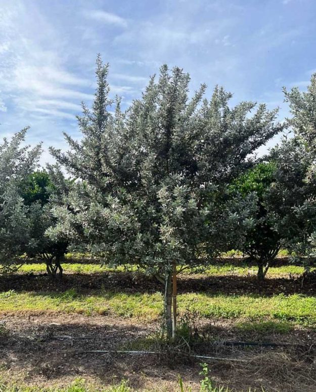 This evergreen tree, characterized by its low-branching and multi-trunked structure, features silvery leaves that owe their appearance to the silky hairs on their surface.